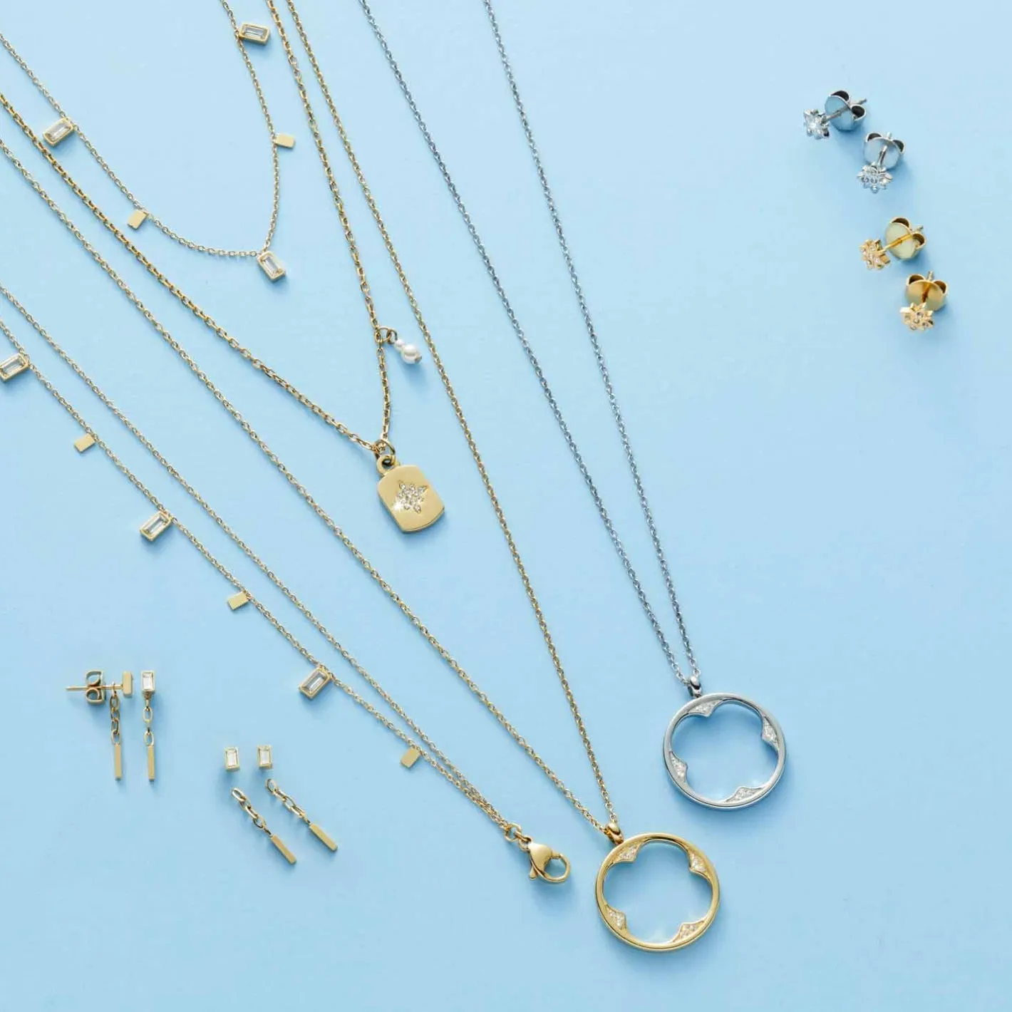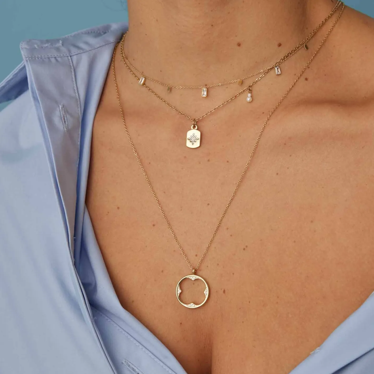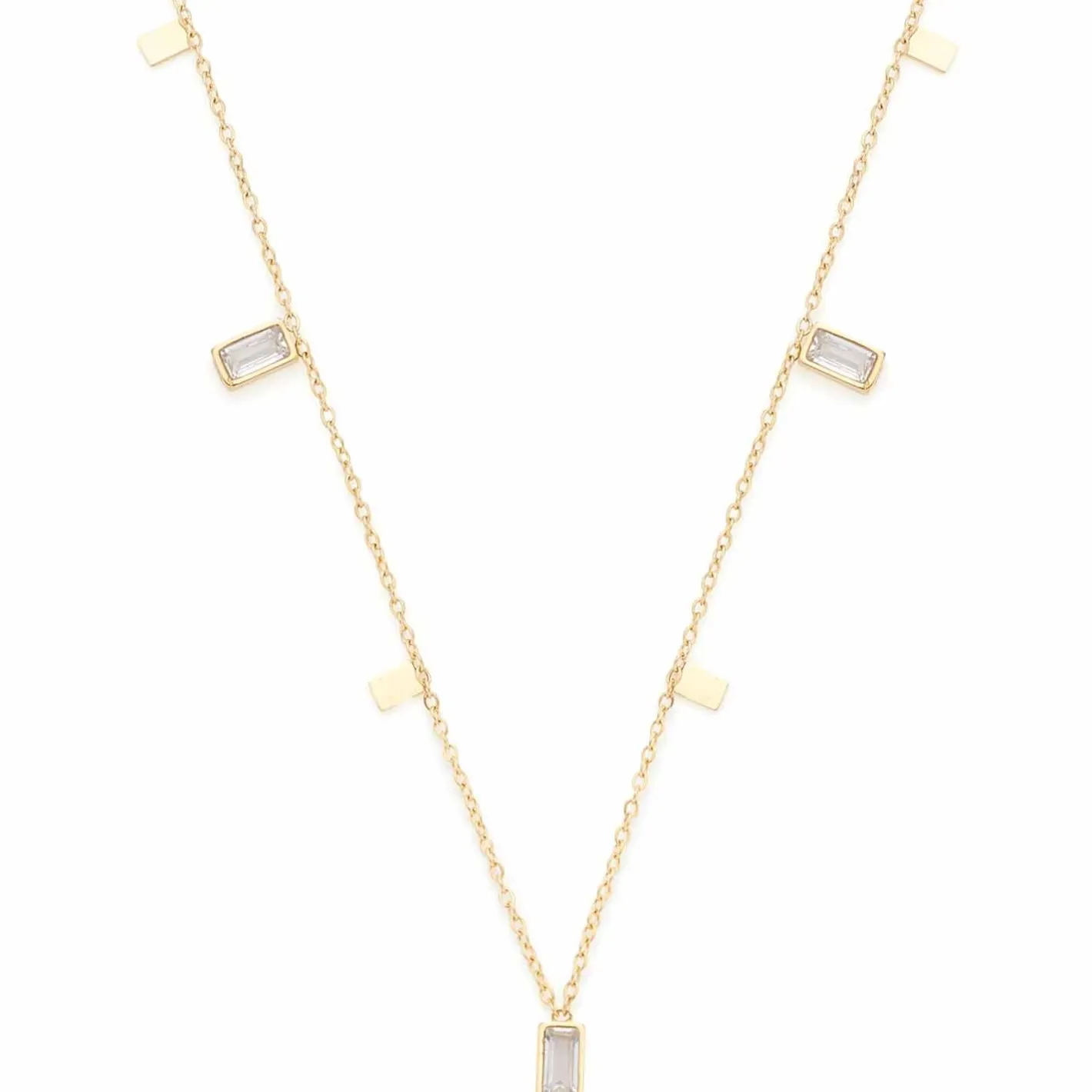 Die Halskette schmiegt sich ganz sanft an den Hals und fügt sich dabei unterschiedlichsten Stilrichtungen ein. Dank der feinen Optik eignet sich die Kette auch ideal für moderne Layering-Looks. Mit ihren abwechselnd angehängten, kleinen Baguette Steinen und rechteckigen Plättchen erhält die sehr feine Kette einen eleganten Hingucker. Ein Karabinerverschluss und eine Verlängerungskette verschaffen ihr ein angenehmes und flexibles Tragegefühl.