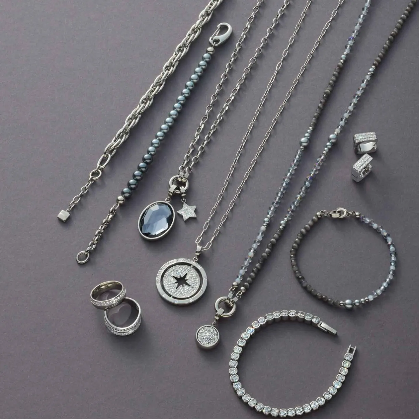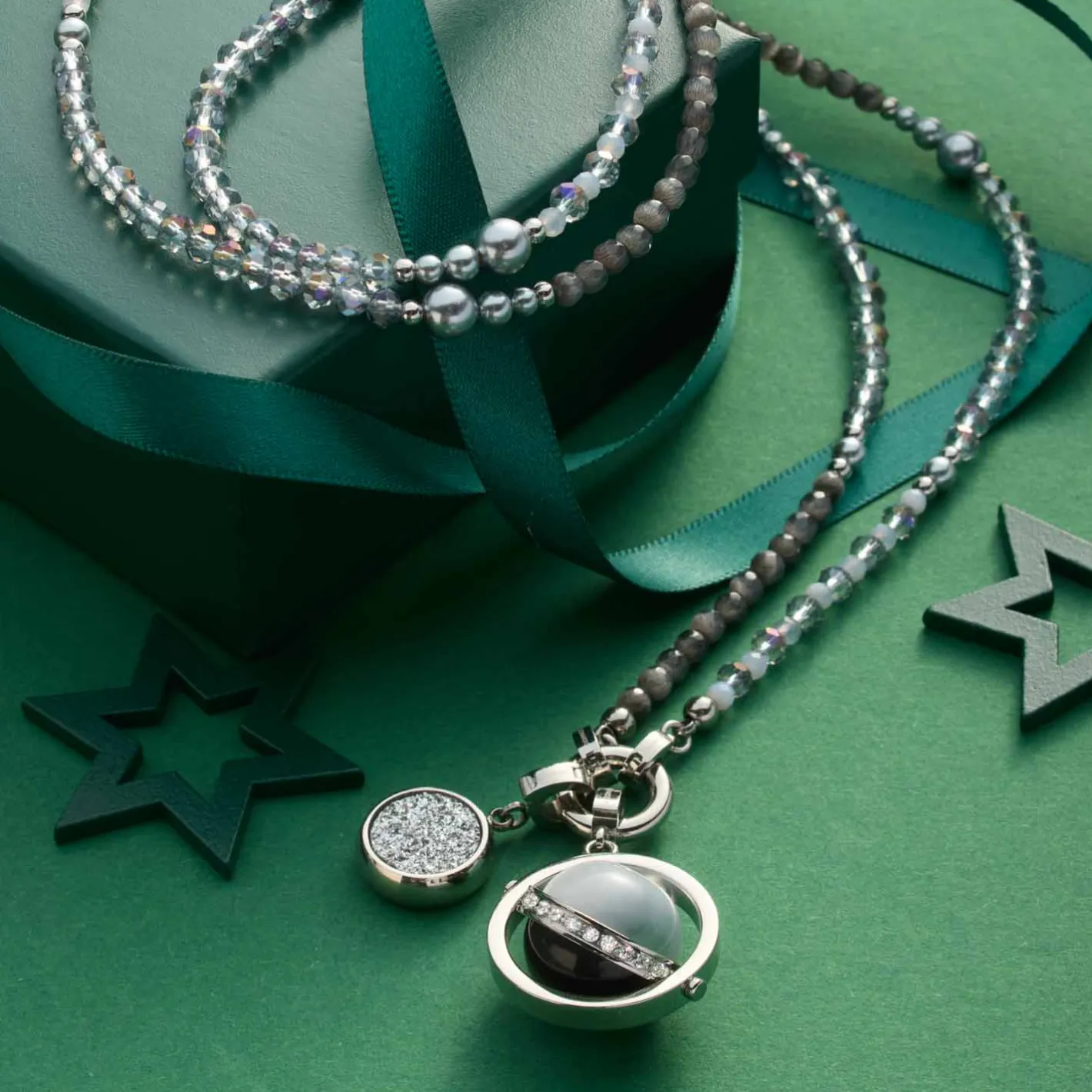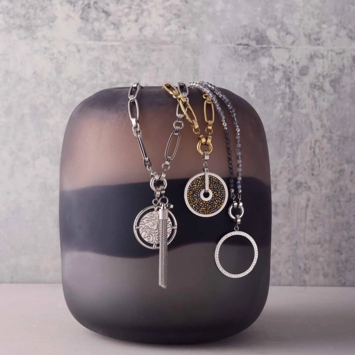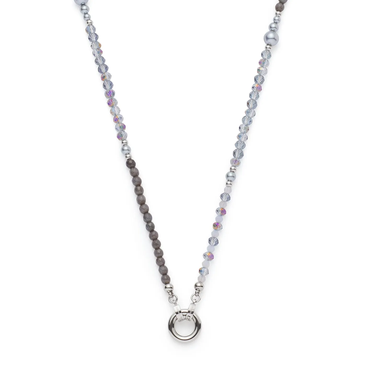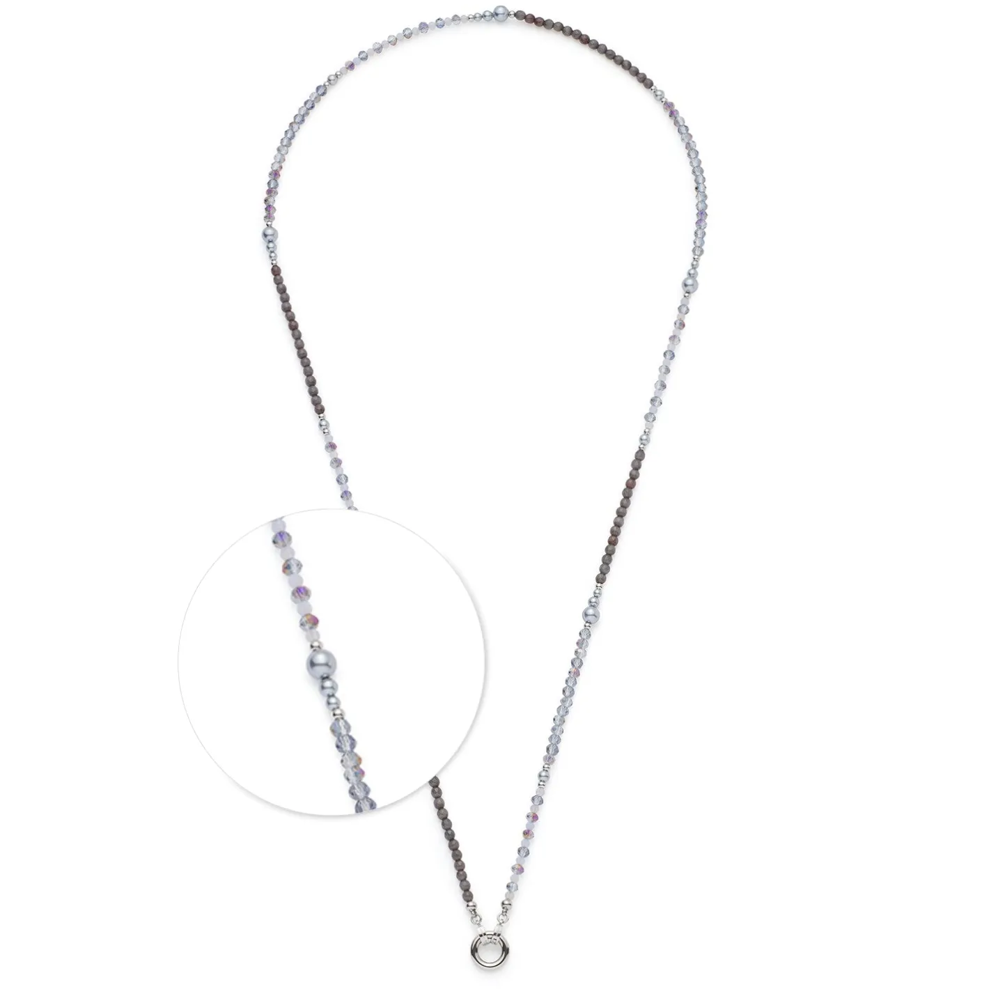 Die Halskette MANON begeistert mit einem faszinierenden Wechselspiel aus Farben und Formen. Gereihte Glasschliffperlen in zartem Grau-Blau treffen auf tiefdunkle Catseye-Perlen und helle Akzente, während natürlich wirkende, graue Perlen in sanftem Größenverlauf für fließende Übergänge sorgen. Die elegante Länge der Kette macht sie zu einem vielseitigen Begleiter – dezent im Alltag oder als stilvolles Statement. Dank der Clip & Mix Funktion kannst Du die Kette individuell gestalten und mit bis zu zwei Anhängern Deine persönliche Note setzen.