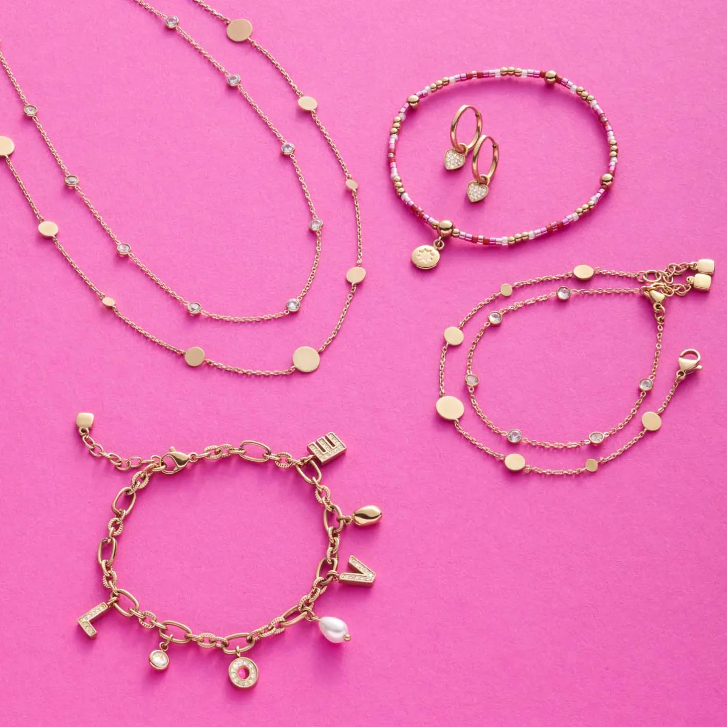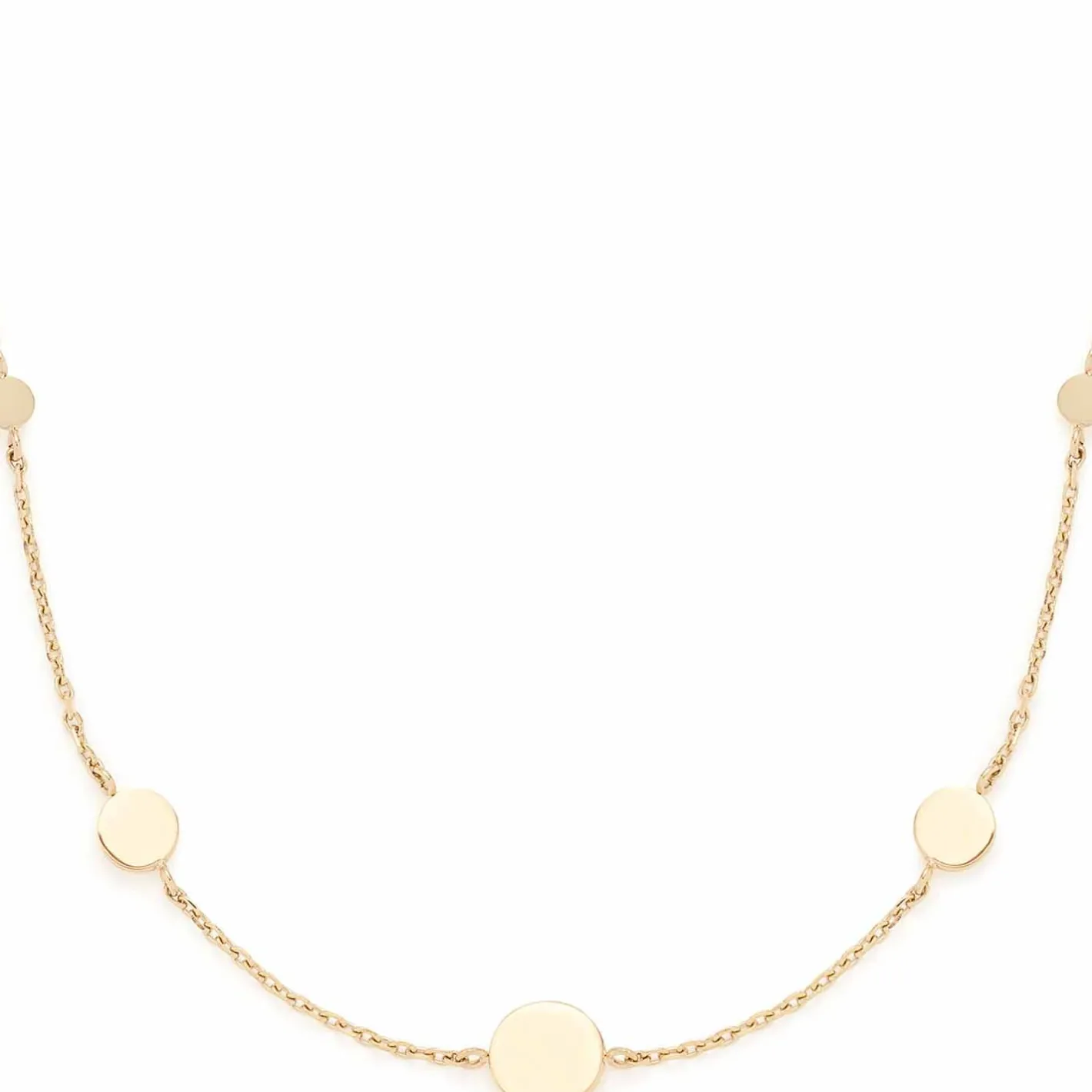 Ein zeitloses Schmuckstück, das viele Looks auf nonchalante und stilvolle Weise ergänzt. In die zarte, weite Vierkant-Ankerkette sind schlichte, runde Plättchen von unterschiedlicher Größe eigenhängt. Über den Karabinerverschluss mit Verlängerungskettchen lässt sich die feine Kette in ihrer Länge variieren. Minimalistische Ästhetik in seiner schönsten Form.