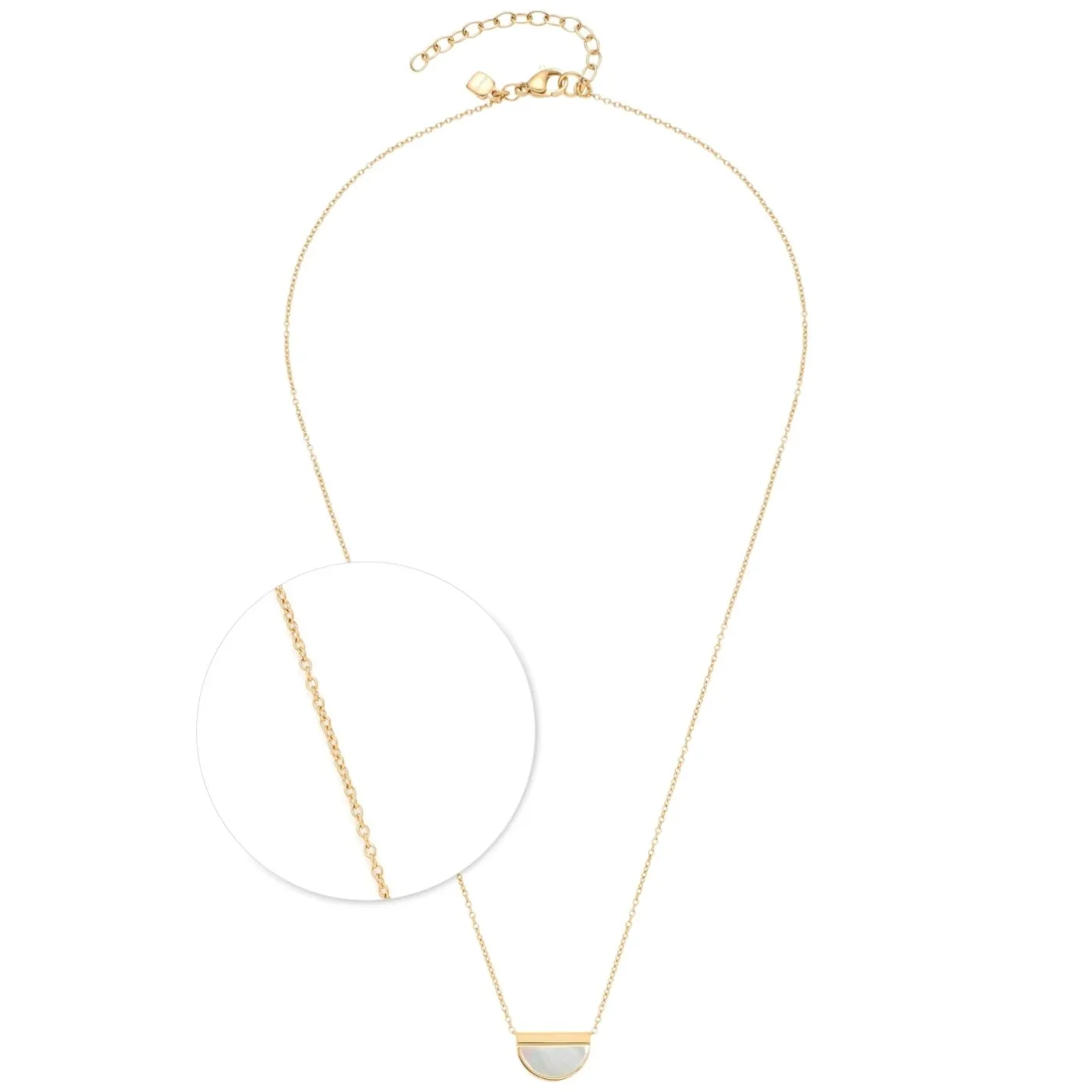 Quer getragene Anhänger, auch Crossways genannt, steigen diese Saison zum absoluten Schmucktrend empor. Dabei lässt sich das halbkreisförmige, flächige Perlmutt-Element auf dem grazil wirkenden Ankerkettchen frei bewegen. Die halsnahe Edelstahl-Kette mit goldener Ionenplattierung schließt mit Karabinerverschluss und Verlängerungskettchen, der Anhänger kann auf der Rückseite mit einer personalisierten Gravur versehen werden.