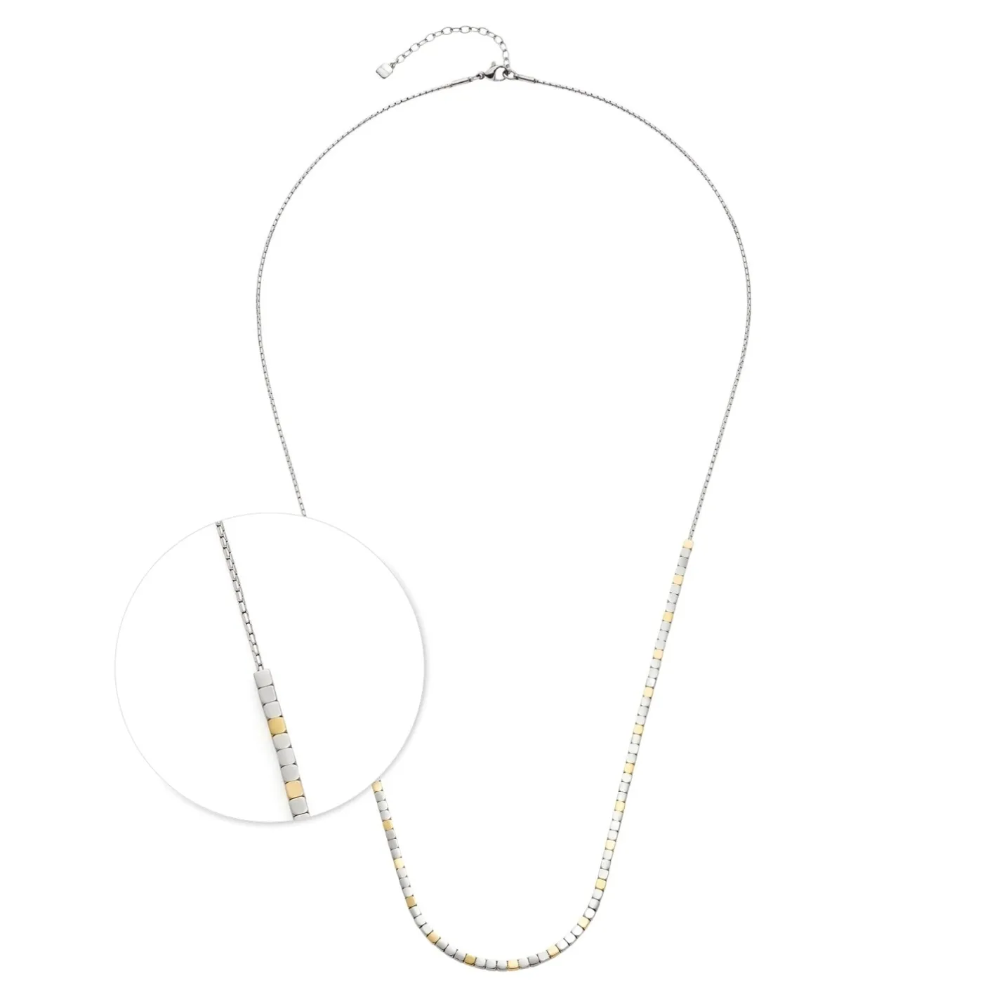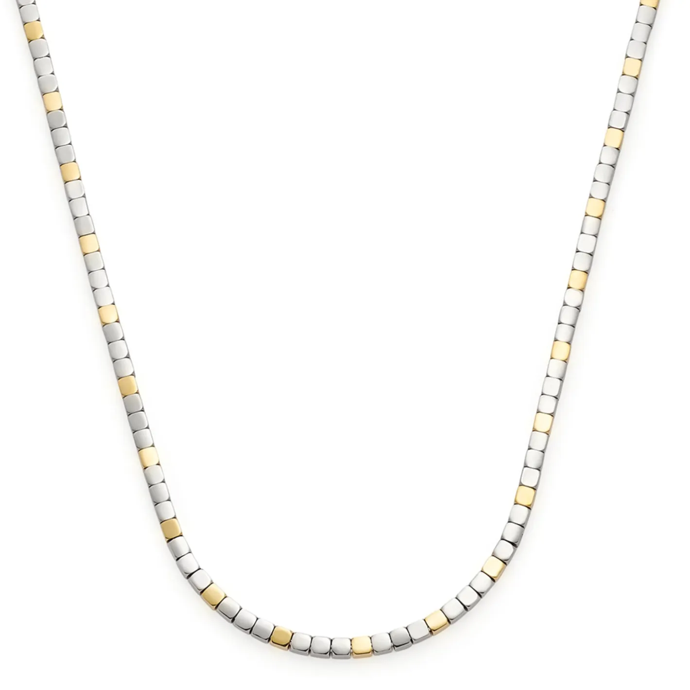 Purismus steht bei dieser langen Halskette im Fokus. Dafür setzt sich das klar gestaltete Schmuckstück im vorderen Bereich aus kleinen, aneinandergereihten Edelstahlwürfeln in modischer Bicolor-Optik zusammen. Der hintere Teil besteht aus einer weich fließenden, gehämmerten Rundankerkette mit Karabinerverschluss und Verlängerung.