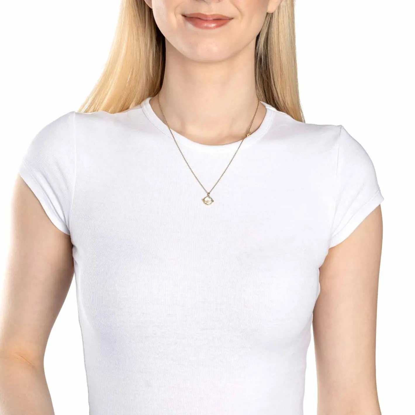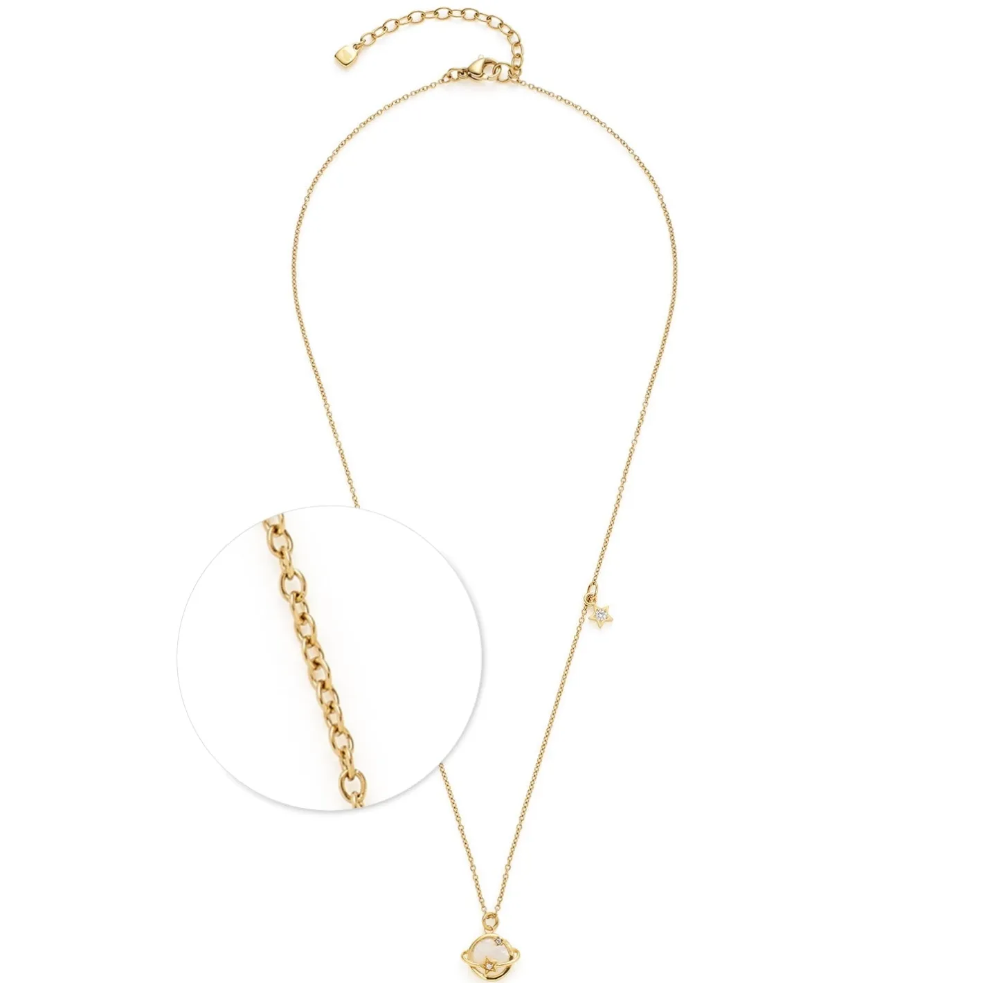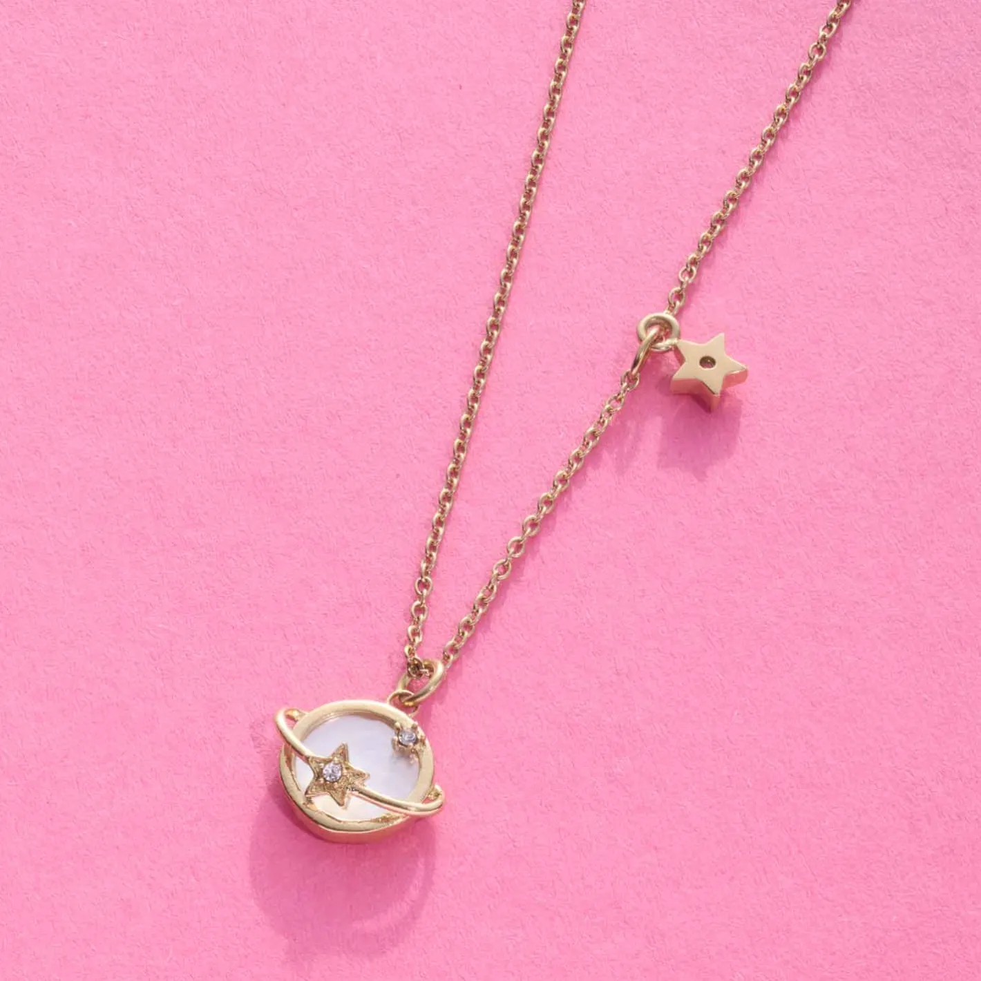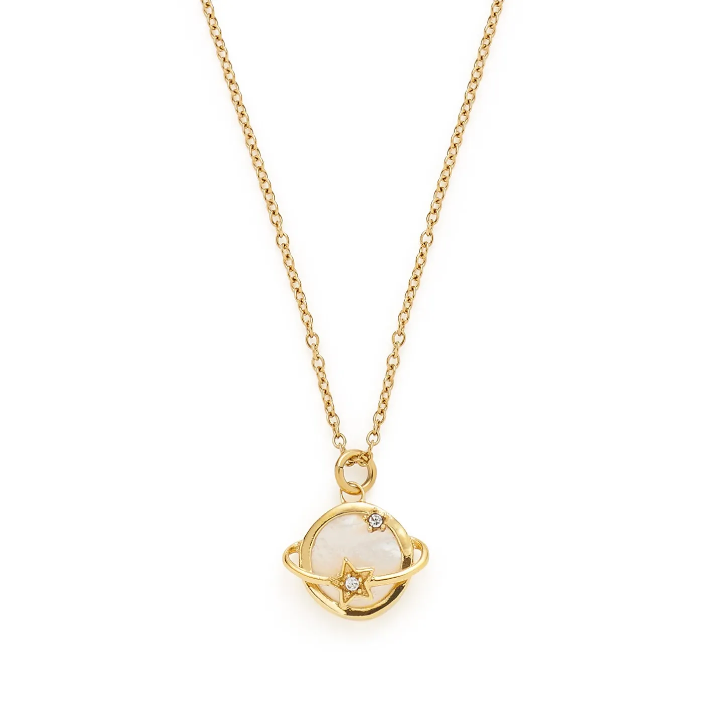 Einzigartig und geheimnisvoll wie die Galaxie erstrahlt auch diese Kette mit Saturn-Anhänger. Zu sehen ist eine kleine Perlmutt-Kugel mit stilisiertem Ring. Auf diesem sitzt, wie am oberen Rand der Fassung auch, ein kleiner Stern mit mittigem Zirkonia-Steinchen. Das Cosmic-Thema wird mit einem weiteren, eingehängten Sternchen stilvoll aufgefangen. Trage sie als Einzelstück oder füge sie anderen, dezenten Goldstücken hinzu.