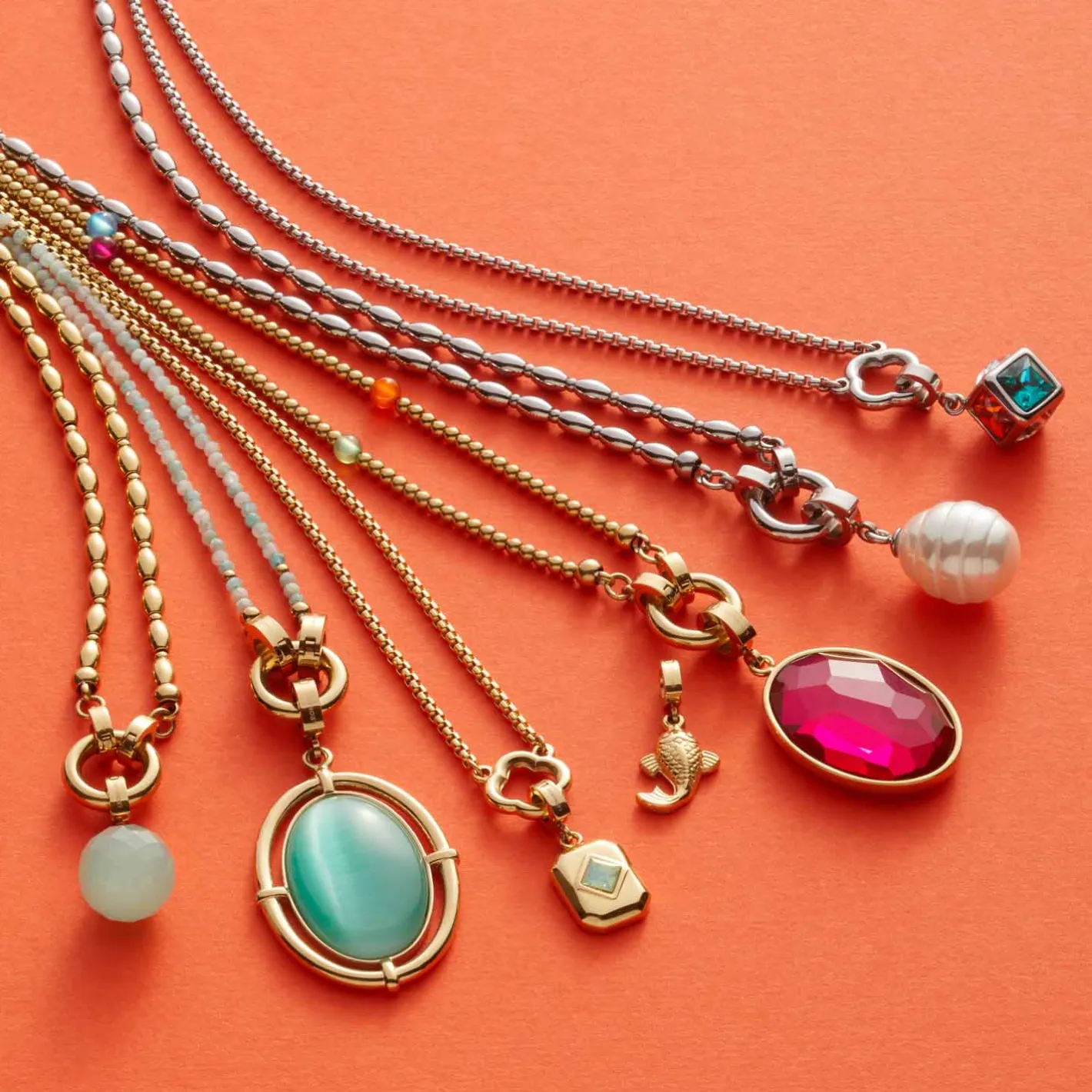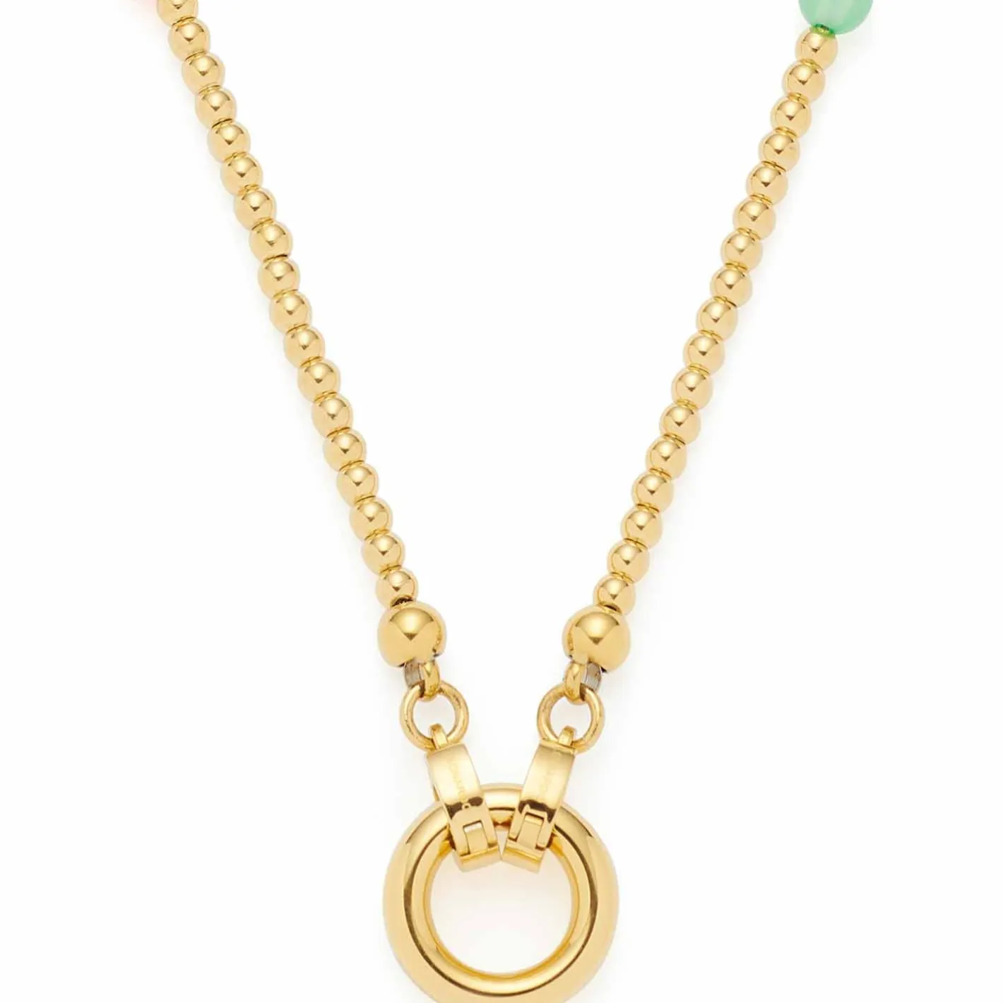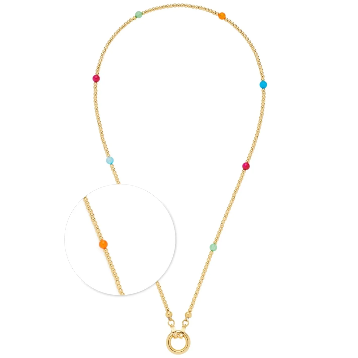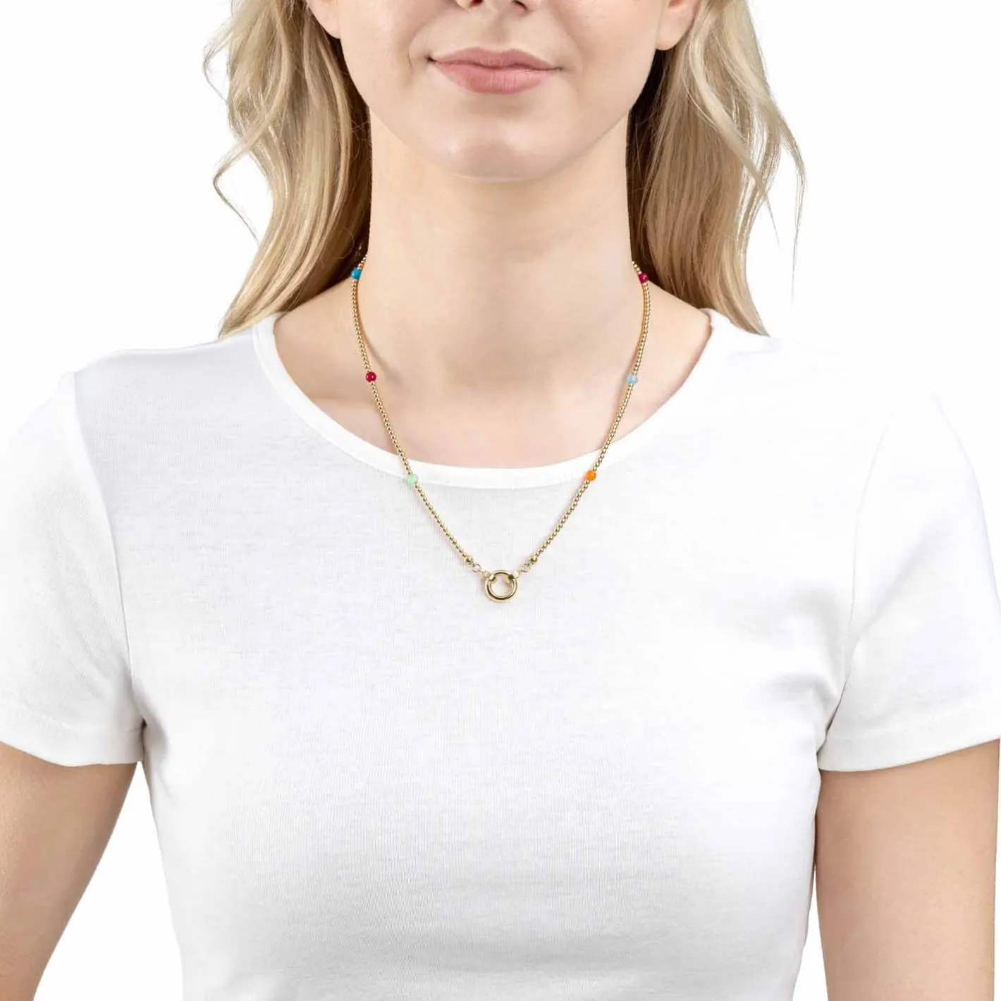 Die kurze Kette aus aneinandergereihten Edelstahl-Kügelchen erhält durch bunte, durchgefärbte Achat-Perlen ein besonderes Finish. Die goldene Ionenplattierung lässt die Farben besonders strahlen. Mit S-Clips und rundem Edelstahlring ist sie Teil der Clip&Mix-Serie und lässt sich vielseitig mit Anhängern und weiteren Ketten kombinieren.