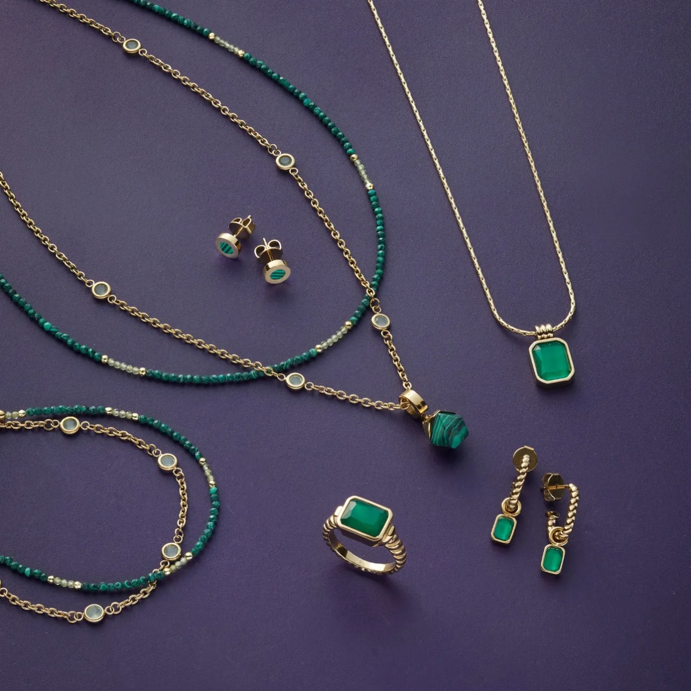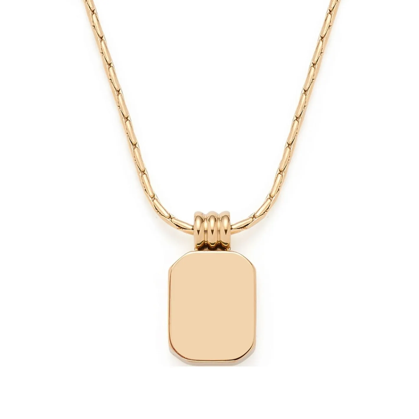 Massiv, opulent, Modetrend: Diese Saison setzen Schmuckstücke auf elegante Grün-Gold-Optiken und geradlinige Baguette-Formen. Die feine Venezianer-Inka-Kette mit Karabinerverschluss und Verlängerungskettchen ist mit einem unübersehbar luxuriös wirkenden Anhänger ausstaffiert. In seiner golden ionenplattierten Edelstahl-Fassung sitzt ein smaragdgrünes Glaskristall-Baguette, die geschlossene Rückseite der Fassung kann mit einer Gravur zusätzlich veredelt werden.