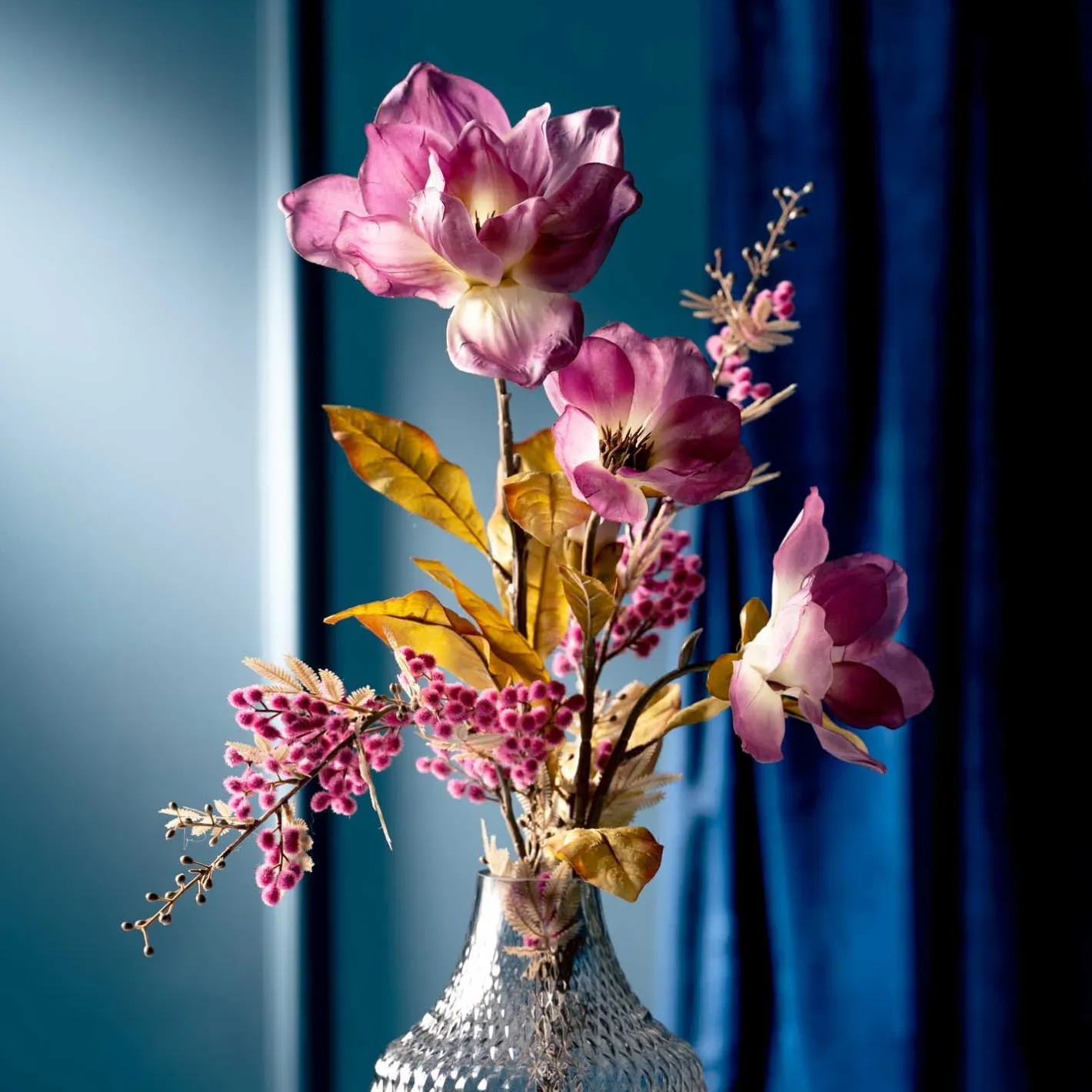 „Die sensible Mimosenpflanze wird auch „“Rühr mich nicht an““ genannt. Diese Mimose aber ist unempfindlich V und dabei mindestens ebenso dekorativ wie ihr Vorbild aus der Natur. Mit seinen zahlreichen kleinen Blüten in leuchtem Violett setzt der Zweig ein raffiniertes Blumen-Statement. „