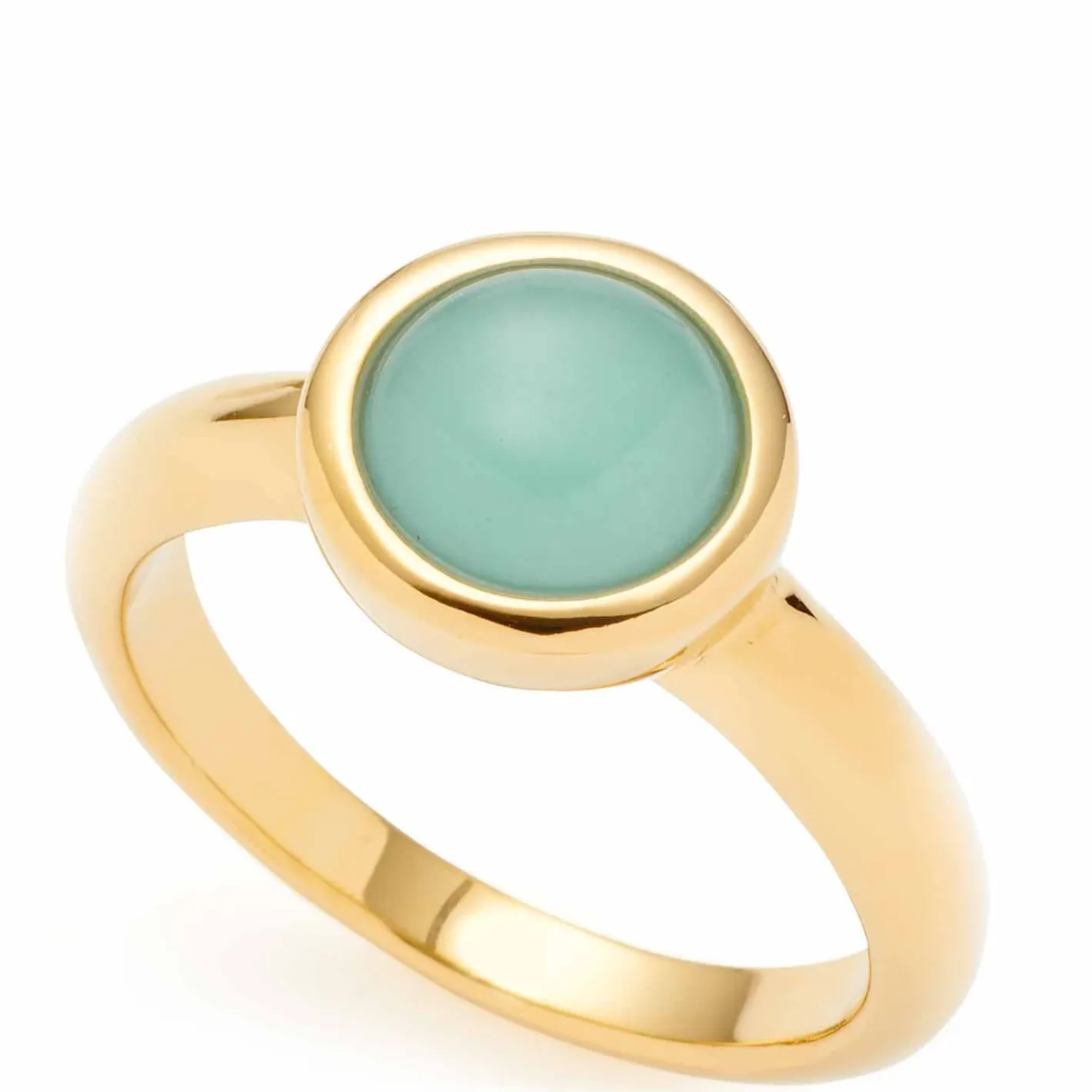 Dieser weich ausgeformte Cocktail-Ring mit rundem Ring-Kopf lädt zum Träumen ein. Oder besser gesagt, kann sich beim Anblick diese lagunenblauen, opaken Glascabochons wahrscheinlich niemand gegen Bilder von türkisblauem Wasser vor weißen Sandstränden verwehren. Der golden ionenplattierte Edelstahl ergänzt das Farbspektakel optimal.