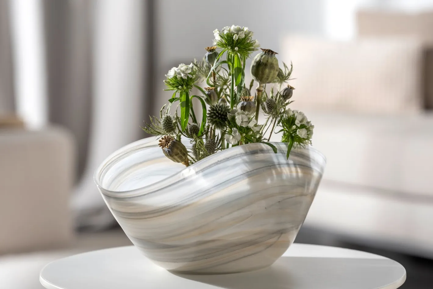 Diese Schale aus geschleudertem Alabasterglas fasziniert mit ihrer einzigartigen Form. Diese vielseitige Schale ergänzt jeden Raum perfekt V sei es als dekoratives Highlight oder als funktionales Element. Lass deiner Kreativität freien Lauf und nutze sie für Dekorationen, als Pflanzgefäß oder Obstschale. Die ALABASTRO Schale vereint Ästhetik und Nutzen auf elegante Weise. Ergänze dein Zuhause mit diesem zeitlosen Schmuckstück!