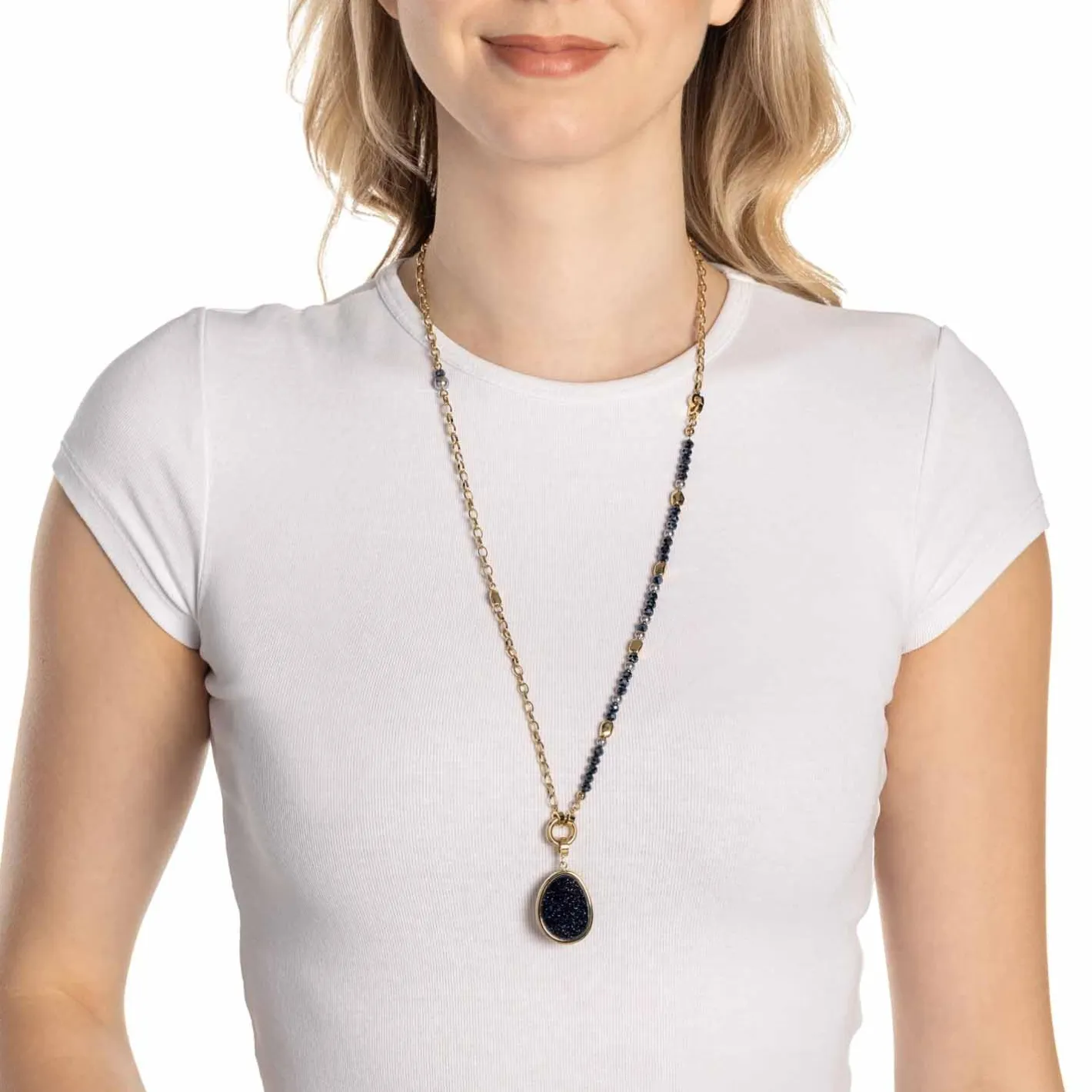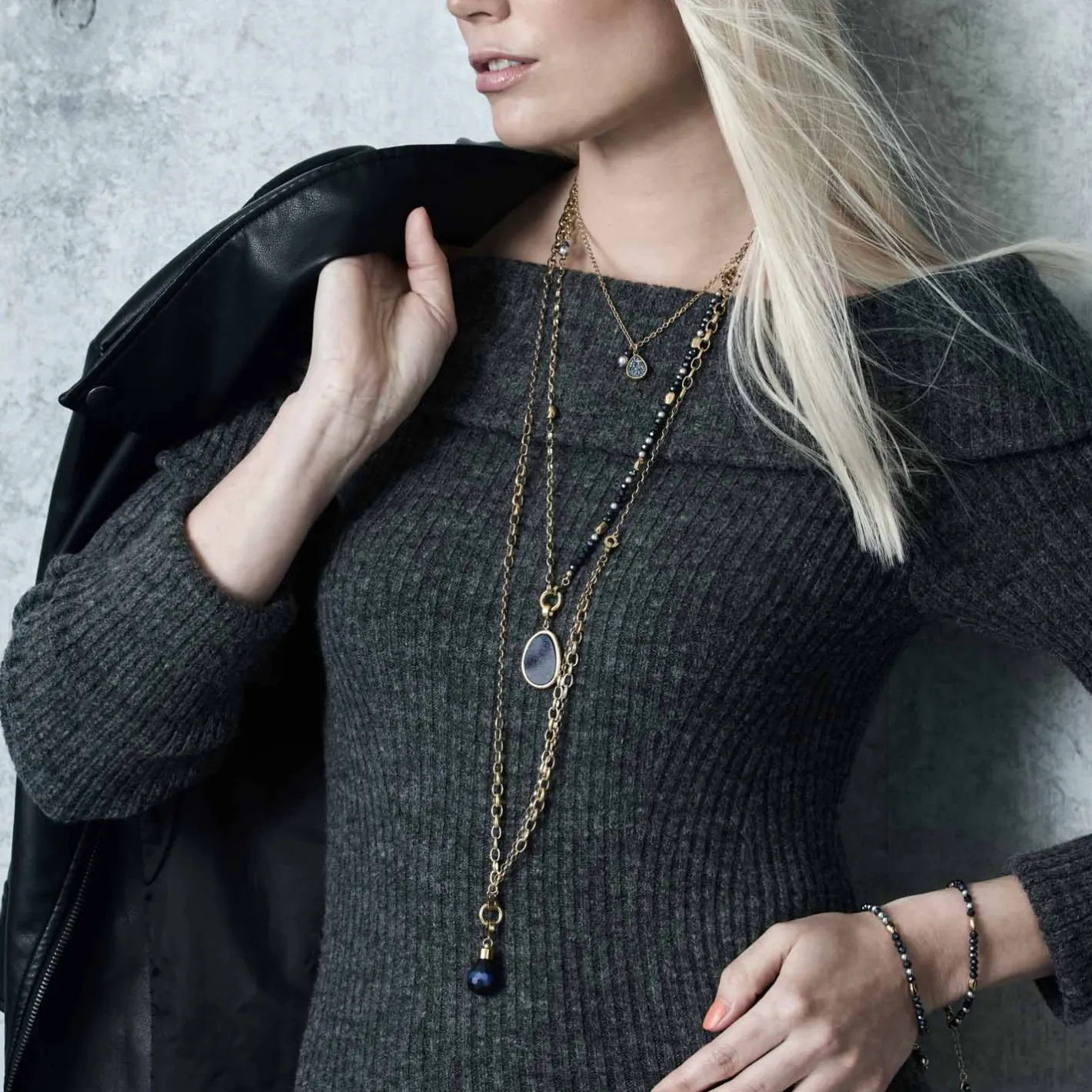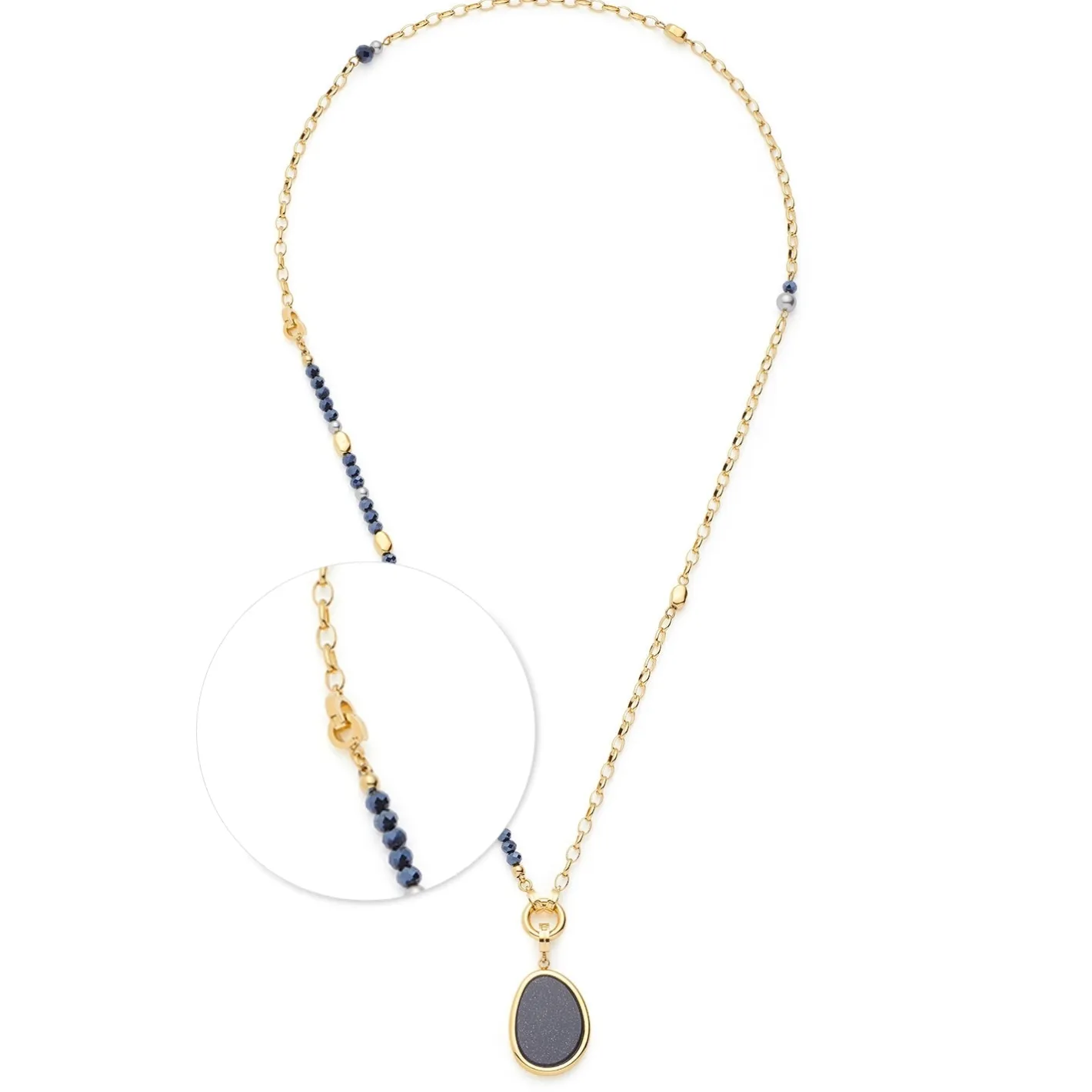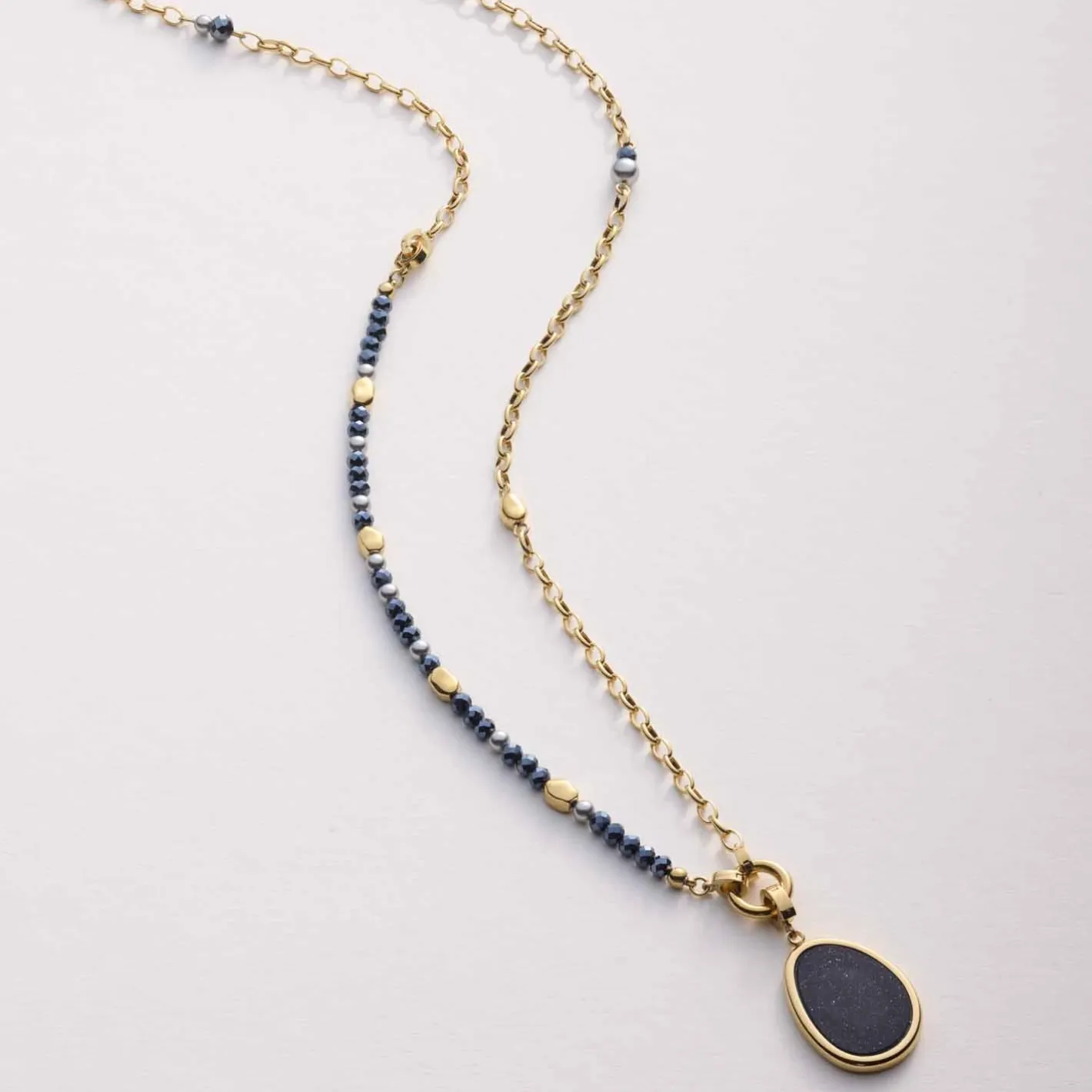Mit dem Set CHARLENE bringst Du pure Wandelbarkeit in Deinen Schmuck-Alltag. Die elegante Weitankerkette aus poliertem Edelstahl mit goldener Ionenplattierung wird durch schimmernde Nuggets, nachtblau funkelnde Glasschliffperlen und sanft graue Akzente zum echten Blickfang. Das Besondere: Dieses Set vereint Kette, Armband und Anhänger in einem – und dank der praktischen Clip & Mix Funktion kannst Du im Handumdrehen bis zu fünf verschiedene Styles kreieren. Der organisch geformte Anhänger mit geheimnisvollem Blaufluss-Stein verleiht Deinem Look eine moderne, aber zugleich natürliche Note. Ob solo, im Set oder kombiniert mit weiteren Schmuckstücken – CHARLENE passt sich Deinem Stil immer wieder neu an.